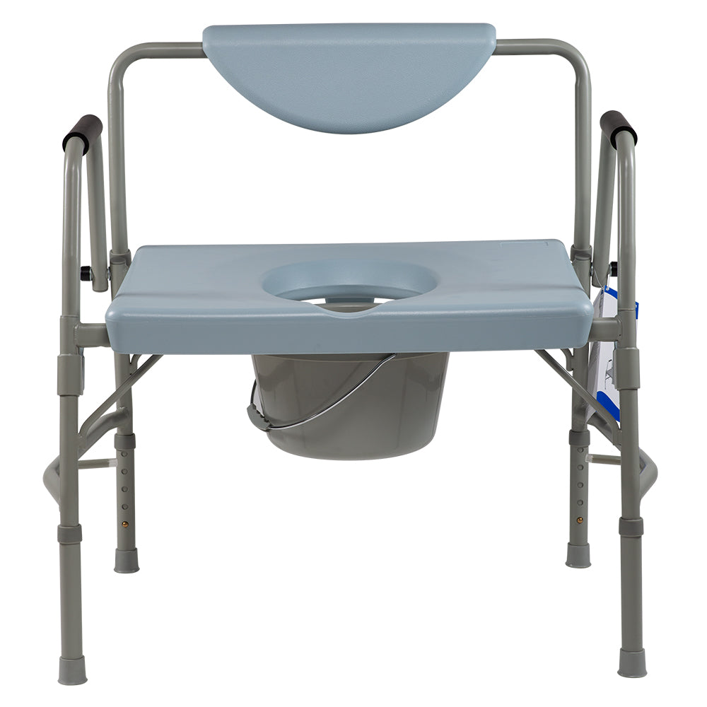 Bariatric Drop Arm Bedside Commode is a versatile, three-in-one commode that can be configured as a commode, raised toilet seat or toilet safety rail over your current toilet. The tool-free design allows for easy set up with height adjustments in 1-inch increments with drop arms allowing for safe lateral patient transfers. This durable, steel welded construction includes a plastic snap on seat with lid, 10-quart drop-in bucket with handle, splash guard and removable tool-free back.